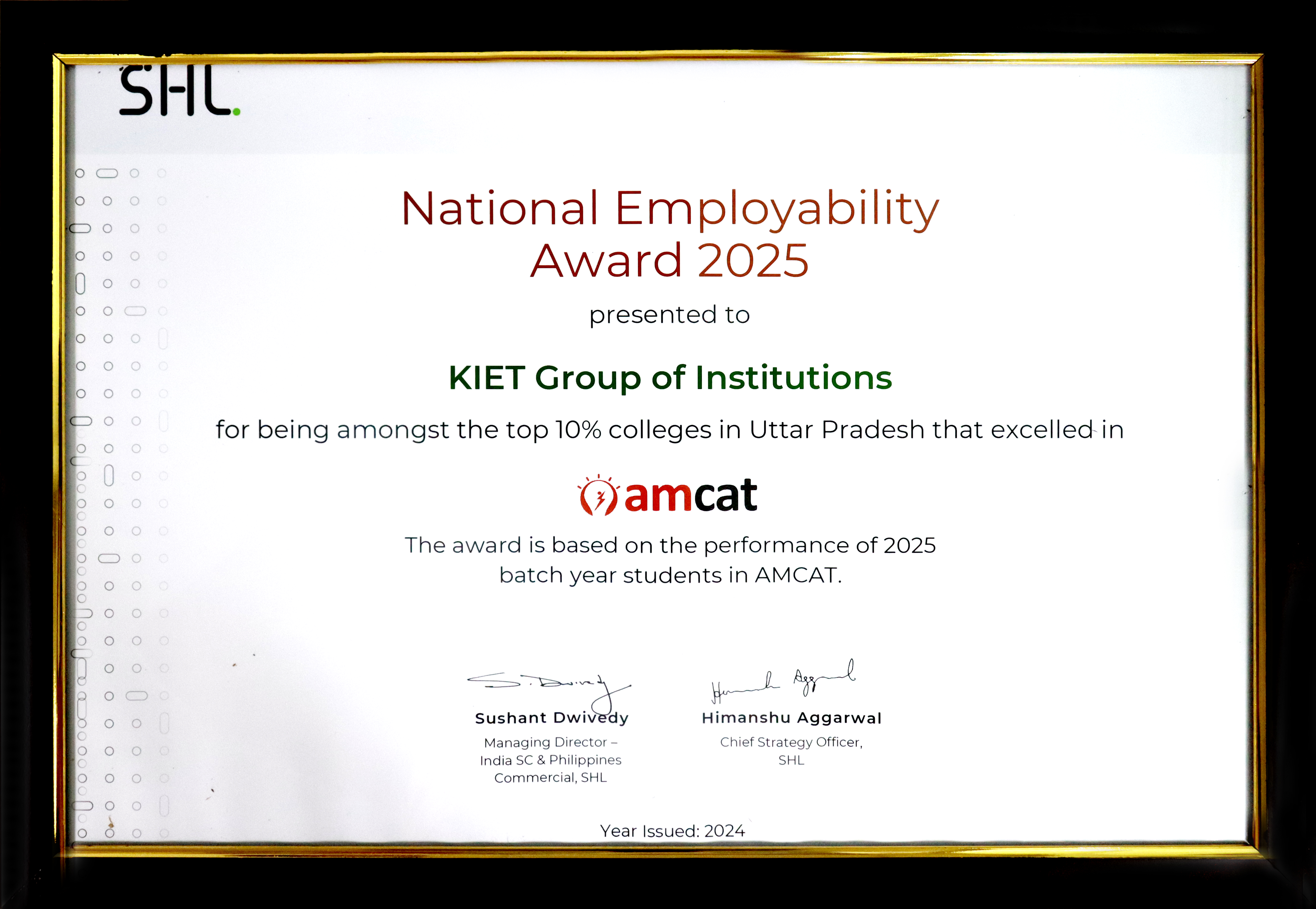 2025KIET has been awarded the prestigious National Employability Award 2025 for being amongst the top 10% colleges in Uttar Pradesh that excelled in AMCAT